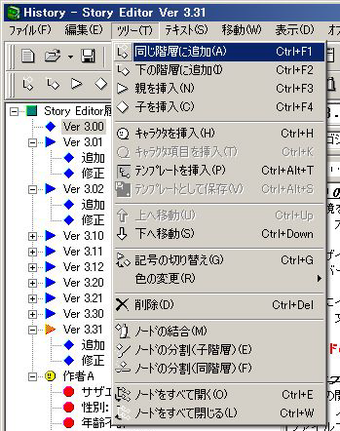 Story Editorの画面は、左側にアウトラインツリー、右にテキストエディターの2ペインで構成されています。「書くこと」を思いついたら、箇条書き感覚で左側に項目(ノード)を作成します。右側にその詳細や補足情報をメモ帳のように書き込みましょう。順序や構成を変えたいときは、左側の項目を動かすと右側の詳細や補足情報も一緒に移動します。項目を複製したり、階層をつけることが簡単にできます。複数のファイル間で項目を移動することも可能です。保存形式はRTF、HTML形式などに対応しています。